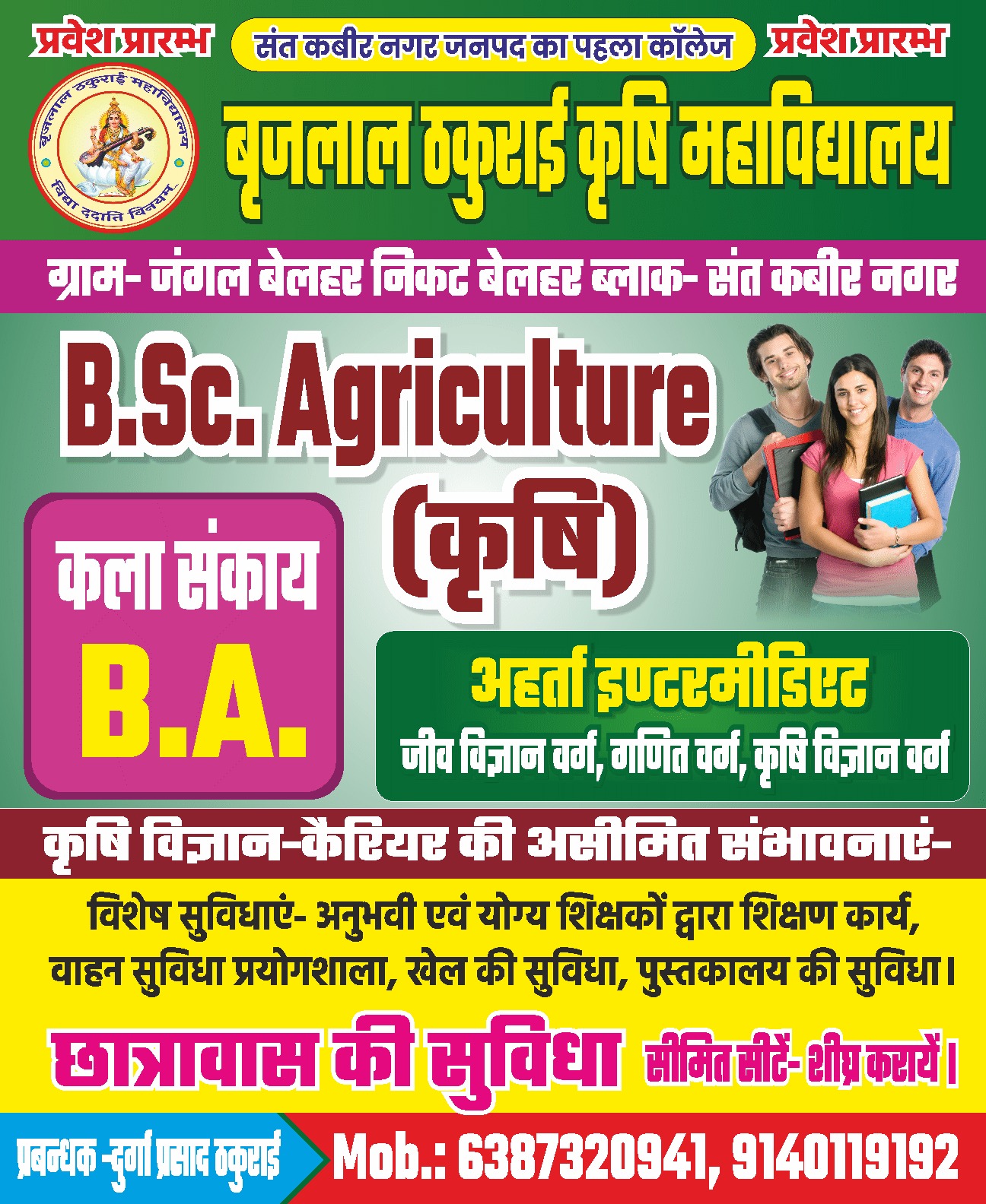बृजलाल ठकुराई कृषि महाविद्यालय, जनपद संत कबीर नगर (उत्तर प्रदेश) का एक प्रतिष्ठित एवं अग्रणी उच्च शिक्षण संस्थान है। यह महाविद्यालय ग्राम जंगल बेलहर, बेलहर ब्लॉक में स्थित है तथा क्षेत्र के विद्यार्थियों को आधुनिक, गुणवत्तापूर्ण एवं व्यवहारिक शिक्षा प्रदान करने के लिए समर्पित है।